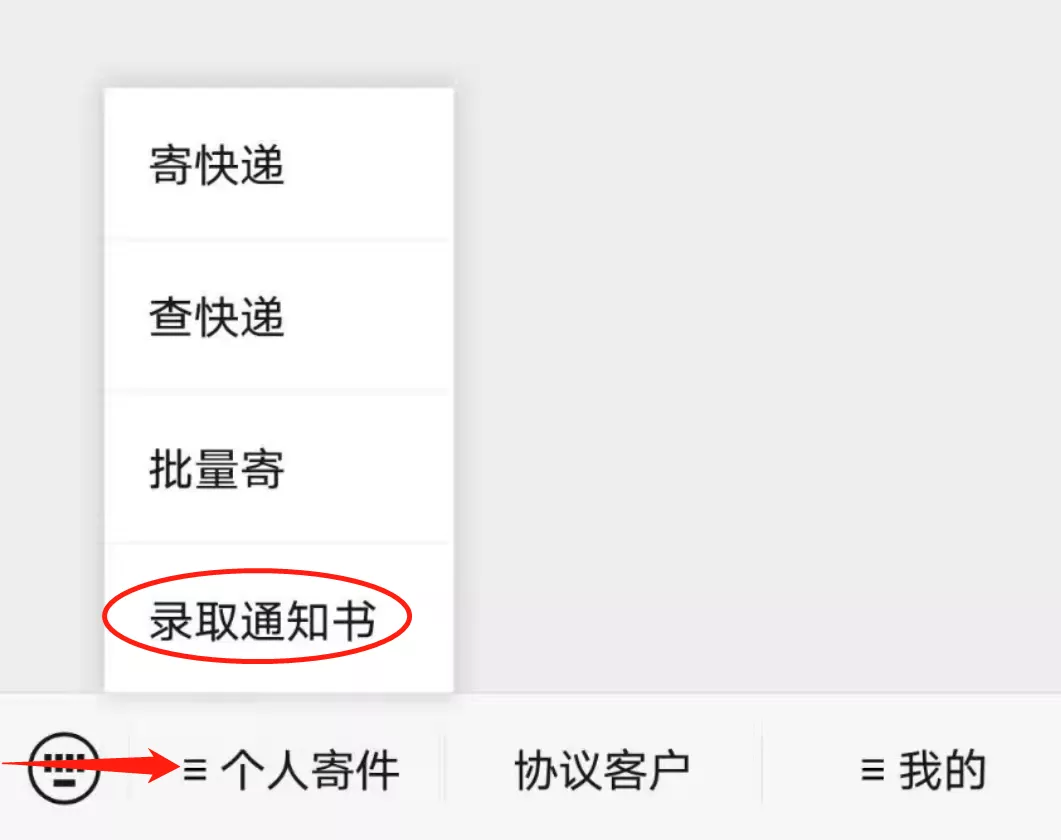 进入聊天框,点击下方菜单的个人寄件进入录取通知书查询页面。