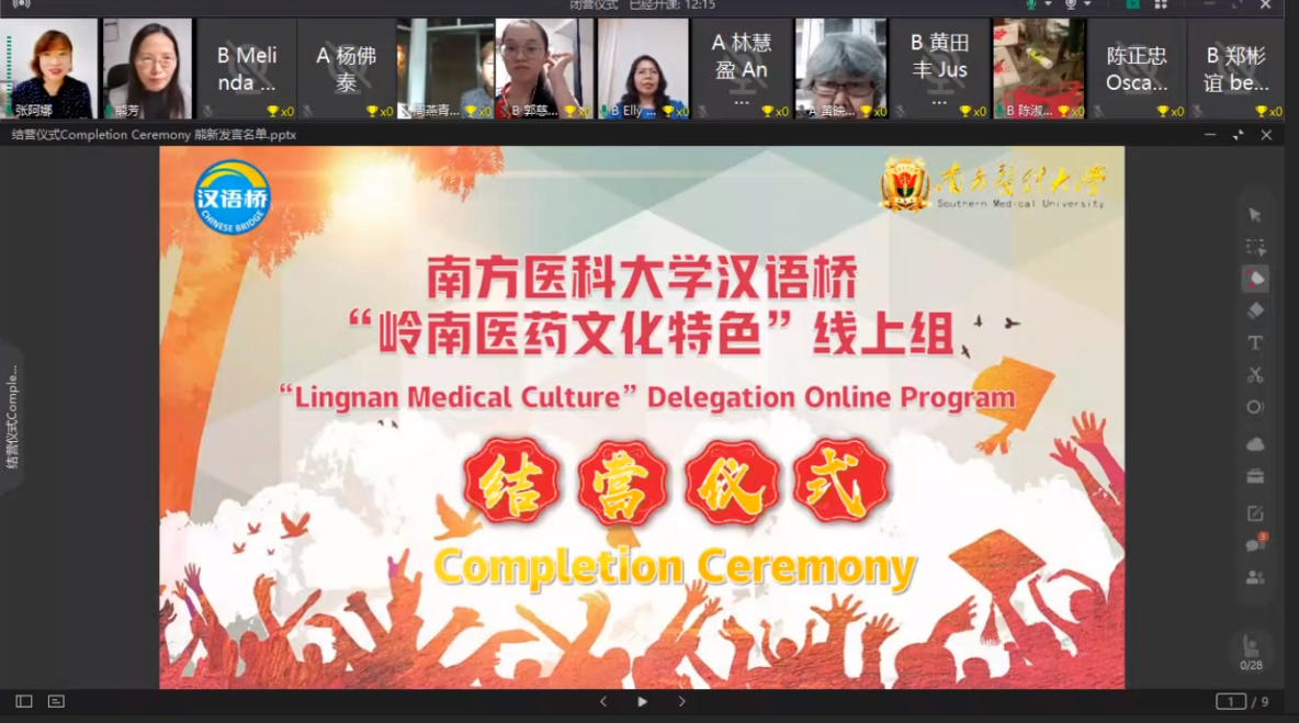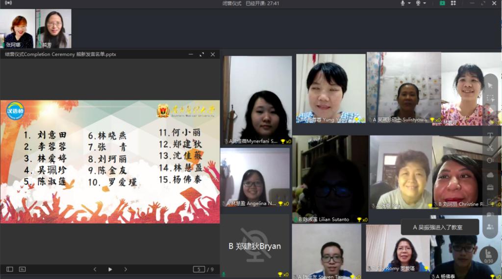2月20日,南方医科大学汉语桥“岭南医药文化特色”冬令营在线上举办了结营仪式。南方医科大学通识教育部熊芳、张阿娜,印尼西加省坤甸共同希望教育基金会辅导主席陈慧珍,印尼共同希望学院教导处主任周燕青和营员们出席了仪式。
