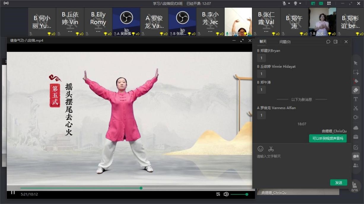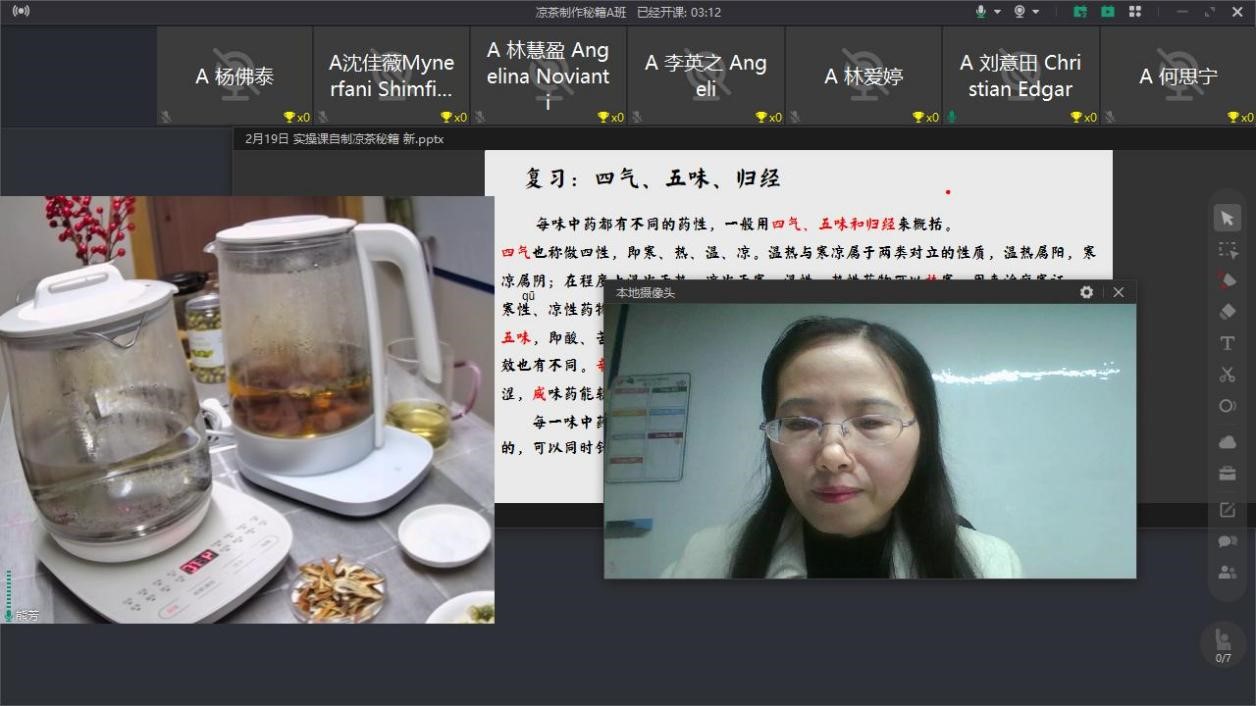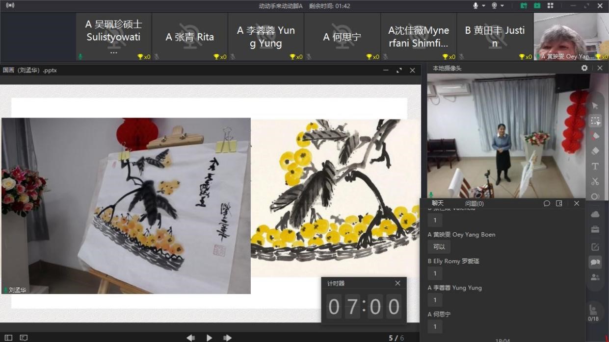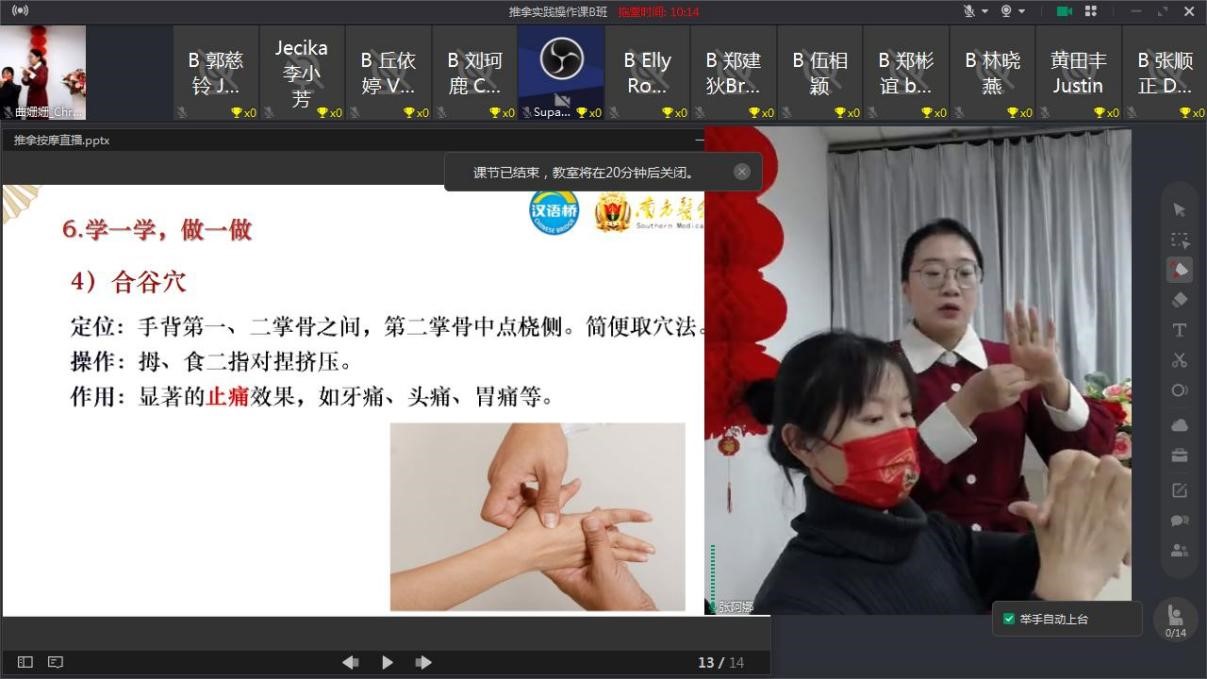 大家回顾了在冬令营直播课程的精彩瞬间,包括《基础医学汉语》《医学中的汉字》《推拿实践》《功夫电影趣配音》《学习八段锦》《国画枇杷》《茶壶剪纸》等特色课程。这些课程围绕语言教学,融合了丰富多彩的岭南医药文化。各位营员们认真参与课堂,与老师积极互动,呈现出了许多优秀的作品。