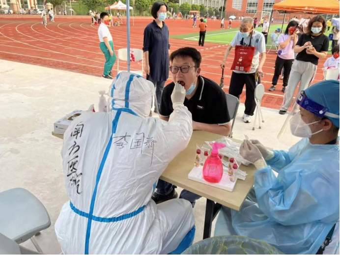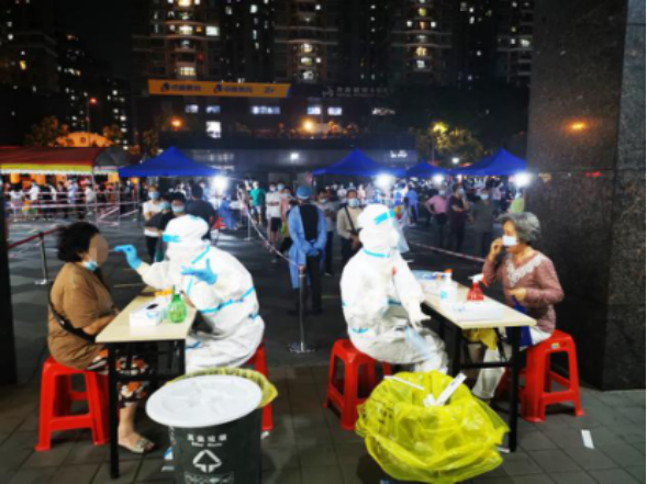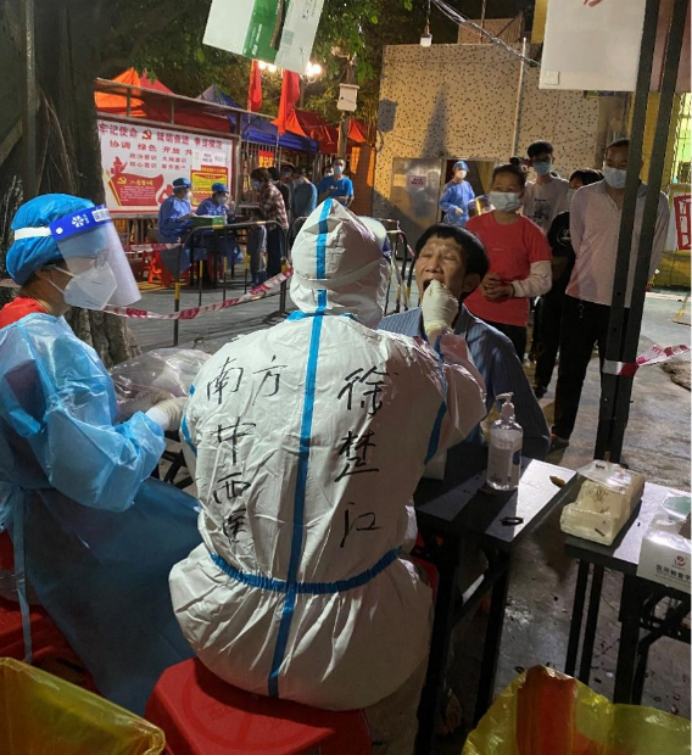 在保障在院患者治疗的前提下,全院上下医护全员参与抗疫,其中南方医院副院长李国新、副院长孙剑发挥党员先锋模范作用,带头出战,紧急召集10名科室主任支援京溪街道社区核酸检测。医疗队在多个采样点帮助了多名幼儿、行动不便的老人、伤残人士。为尽力做到应检尽检,不漏一人,医疗队还专门派员上门提供检测。