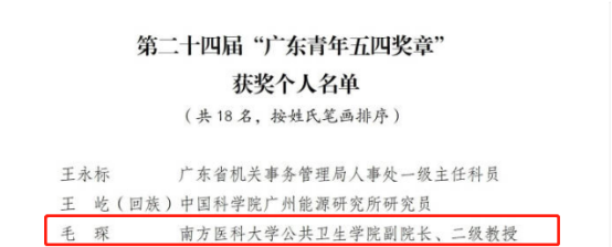 4月28日,共青团广东省委员会、广东省青年联合会联合印发《关于颁授第二十四届“广东青年五四奖章”的决定》(以下简称“决定”),决定授予18名个人、10个集体第二十四届“广东青年五四奖章”。我校公共卫生学院副院长毛琛获得“广东青年五四奖章”。