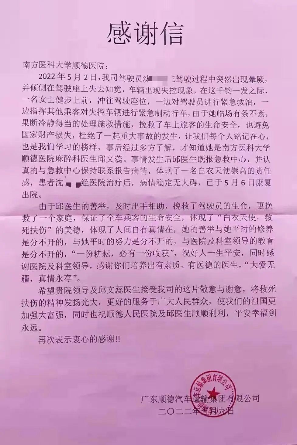 司机沈师傅在病情稳定后康复出院,他和公交公司相关人员经过多方了解,得知邱文蕊是南方医科大学的学生,现在在南方医科大学顺德医院麻醉科实习。5月9日,沈师傅和相关负责人带着写有“助人为乐、救死扶伤”的锦旗、感谢信和鲜花,特意赶到医院,表达他们对邱文蕊见义勇为的谢意,此时,邱文蕊的事迹才被大家得知。