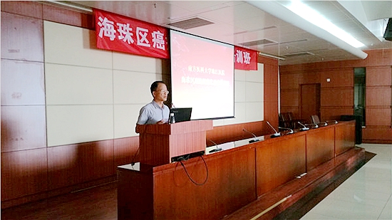 为更好地提高晚期癌症患者的生活质量,减轻疼痛,配合广东省卫计委关于进一步推动癌痛规范化治疗工作通知,肿瘤中心医护党员刻苦钻研癌痛治疗技术。今年3月,肿瘤中心获“广东省癌痛规范化治疗示范基地”称号,中心主任汪森明教授入选广东省癌痛规范化治疗专家组。在赢得荣誉的同时,肿瘤中心党支部也时刻不忘肩负重任,积极承担了在广州海珠区以及广东省多家县级医院推广癌痛规范化治疗的工作。在海珠区卫计委及医院领导的支持下,肿瘤中心于5月23日举办了“海珠区癌痛规范化治疗培训班”,共有 200多名医护人员参加。