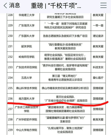 在团中央学校部的指导下,由中国青年报社、人民网共同主办的2017年全国大中专学生“三下乡”社会实践“千校千项”成果遴选活动中,卫生管理学院普天社会实践队“广东省分级诊疗社会调研”实践项目突破重围,当选“千校千项”遴选活动最具影响好项目。同时,该项目也是我校唯一获此膺荣的项目。