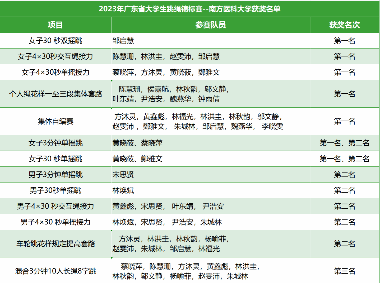 自2021年以来,我校连续三年举办全校跳绳比赛;2022年,我校成为广东省学生体育艺术联合会跳绳分会会长单位。在前期对跳绳项目的大力推动基础上,发掘和培养了一大批热爱跳绳的学生,并成立了跳绳队。今年,是我校跳绳队成立第二年,也是校跳绳队第二次参加大学生跳绳锦标赛,团体总分从去年的第二名进步到第一名。在赛场上不断进步,突破自己,离不开教练的指导和队员们的努力。校跳绳队将顽强拼搏,脚踏实地,争取更大的进步。