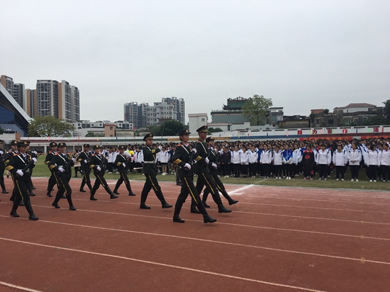 2017年11月21日,为提高弘扬国旗文化,我校国旗护卫队队员应邀前往佛山市顺德区容山中学参加校运会汇报演出,在运动员入场过后,我校国旗护卫队队员喊着嘹亮的口号、迈着整齐划一的步伐行进经过,向容山中学展示了我校护旗队的风采,得到了该校校领导一致好评,圆满完成此次共建交流活动。