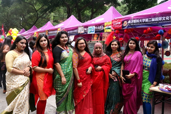 本次世界美食与文化荟萃共设有40个展棚,来自世界各地的学生纷纷拿出最具地域特色的美食、特产、手工艺品,通过趣味游戏、互动环节等吸引观众驻足交流,展示了本国文化的独特魅力。柬埔寨学生带来了榴莲糯米糕、阿莫克鱼、仙草冻等自制食物,被观众一抢而空。尼泊尔的咖喱鸡肉馅饺子则激起了现场中国学生的好奇心,纷纷要求尝试。来自巴基斯坦的学生跳起了阿拉伯舞蹈,并现场进行教学。活动现场还专门设置了留学生摄影风采展区,留学生们用他们手中的镜头展现了自己眼中的南医求学岁月。