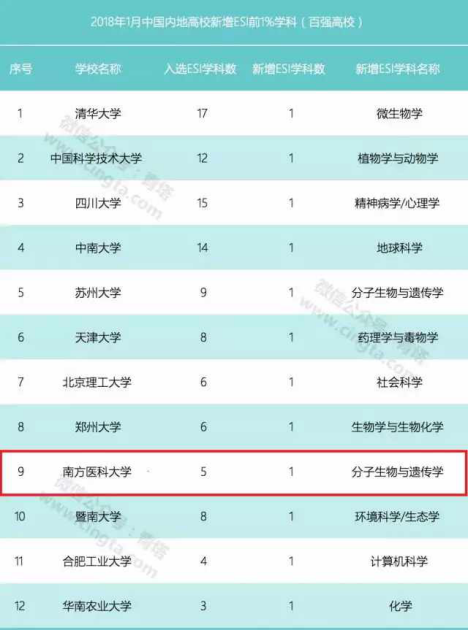1月,最新ESI中国大学综合排名百强日前出炉。我校新增“分子生物与遗传学”进入ESI全球前1%学科。