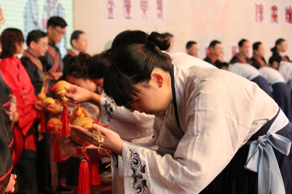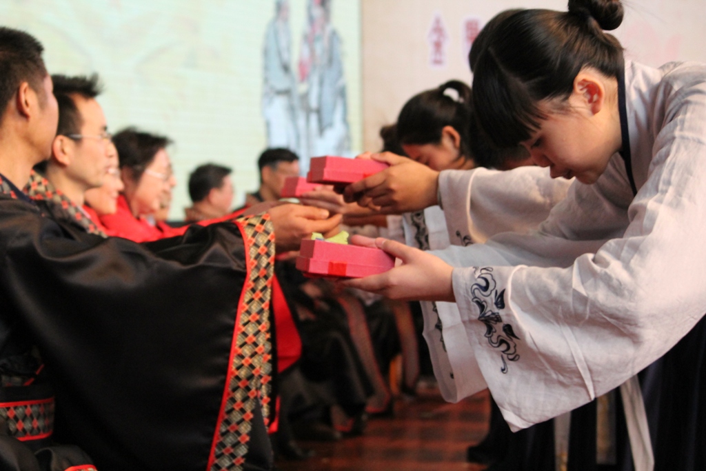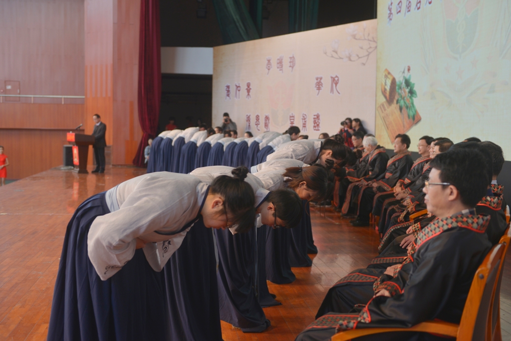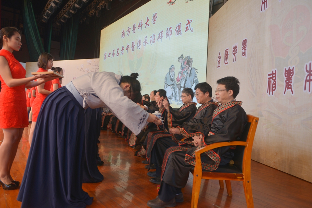 在象征明志和警惕的锣鼓声中,传承班的全体师生们面朝东方敬拜先贤。随后,22名弟子各自向老师呈上拜师帖,并向老师献上六礼束脩,这是古代学生与师长初见面时必先奉赠的礼物,分别有:腊肉、芹菜、莲子、红豆、红枣、桂圆。然后,弟子们向老师们敬奉由红枣和荔枝泡成的“敬师茶”,并向导师行“三拜”拜师礼。接下来,导师们手持刻有《弟子规》的戒尺轻敲弟子,告诫诸位弟子在今后学习和从医的道路上要恪守规范。最后,导师们还向弟子们回赠了带着祝福的葫芦,希望弟子们在四年后能顺利出师,从此“悬壶济世”。
