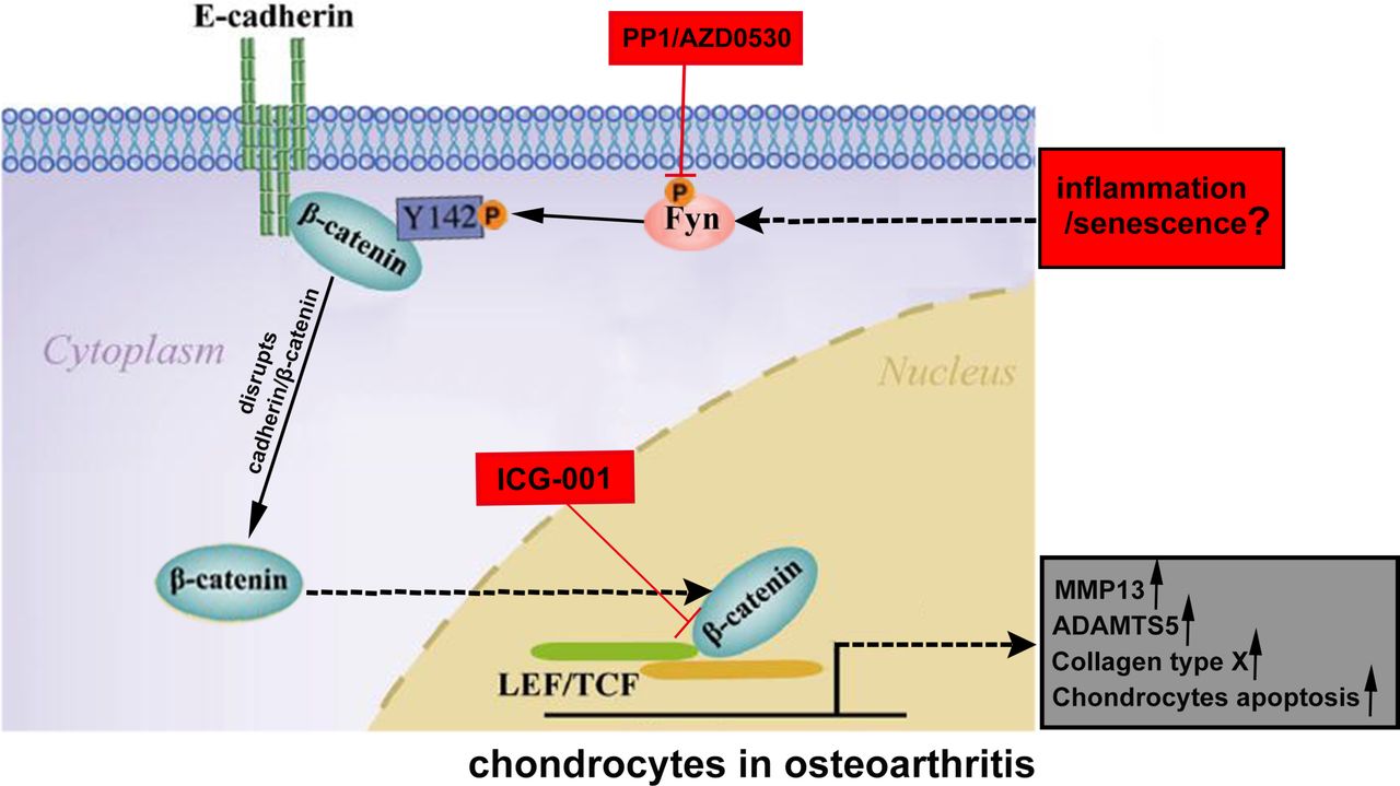 课题组通过蛋白质组学方法筛选到酪氨酸激酶Fyn在退变的人或小鼠关节软骨中表达显著上调。进一步通过Fyn敲除小鼠等模型证实关节软骨细胞内Fyn通过直接磷酸化beta-catenin并激活该通路,促进软骨细胞分泌降解软骨基质的酶,进而引起软骨退变与OA发生。Fyn抑制剂可有效延缓模型小鼠OA进展,为靶向该通路防治OA提供了依据。