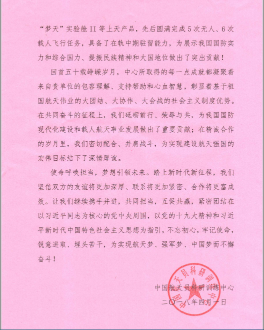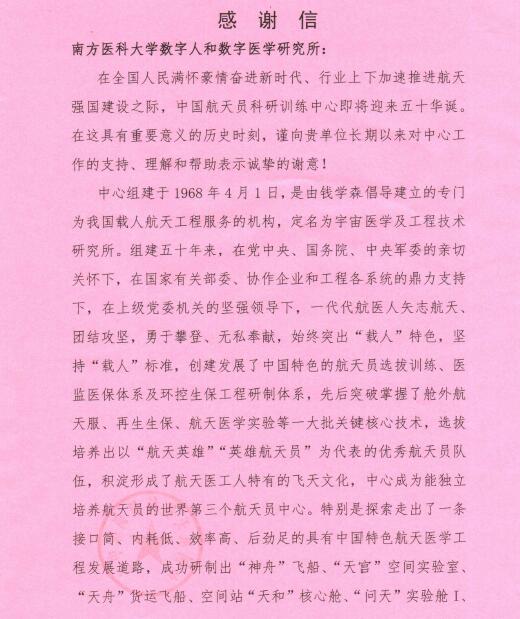 近日,我校收到一封来自中国航天员科研训练中心的感谢信。该中心即将迎来五十华诞,为了表达对我校数字人和数字医学研究所长期以来对祖国载人航天医学做出的贡献,特向学校致以感谢。