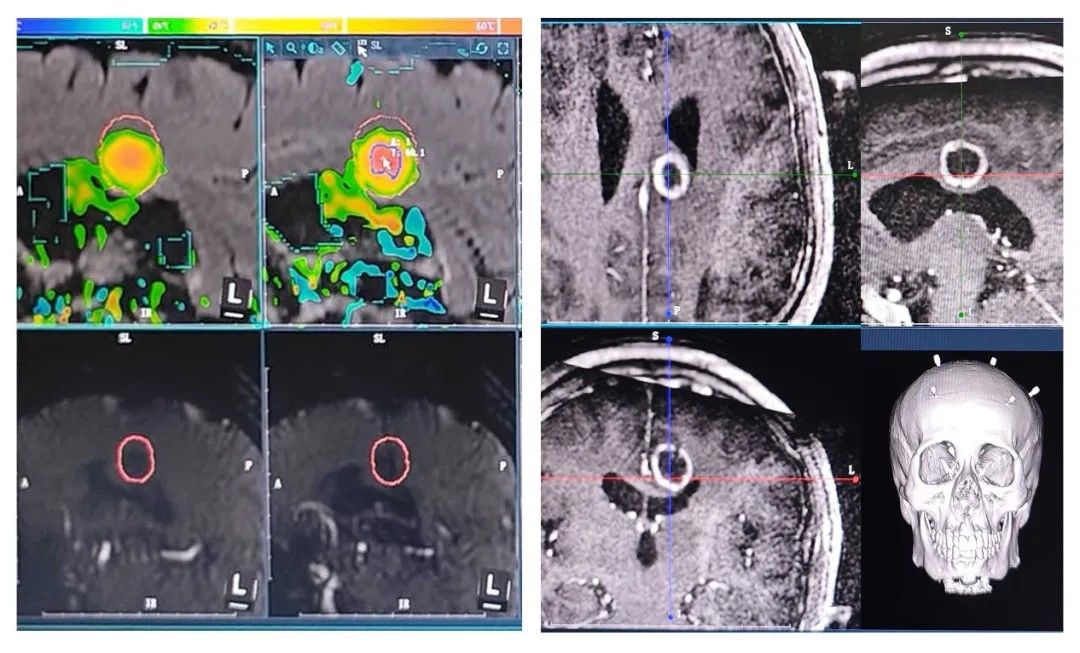 术后即时复查可见消融范围与目标靶区完全吻合,周边结构无损伤,床旁拔除光纤即结束全部治疗,头皮仅有一处针眼大小创口。整个治疗过程李先生清醒配合,无疼痛或其他不适。术后一般情况良好,无并发症,观察数日后现已顺利出院。