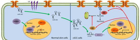 皮肤鳞状细胞癌(简称皮肤鳞癌;Cutaneous Squamous Cell Carcinoma, cSCC)是全球范围内发病率排名第二的癌症,其恶性程度高、转移能力强,5年生存期只有22-56%,每年新发病例超过100万。过量紫外辐射暴露是诱发皮肤鳞癌的首要环境因素,亟需深入了解紫外线诱发皮肤鳞癌的分子机制、开发有效的皮肤鳞癌新疗法。低氧诱导因子HIF-1α对紫外辐射敏感,其表达水平与与皮肤鳞癌细胞增殖和糖酵解代谢水平密切相关,并与皮肤鳞癌分级呈正相关,但之前的研究并未揭示其调控机理。