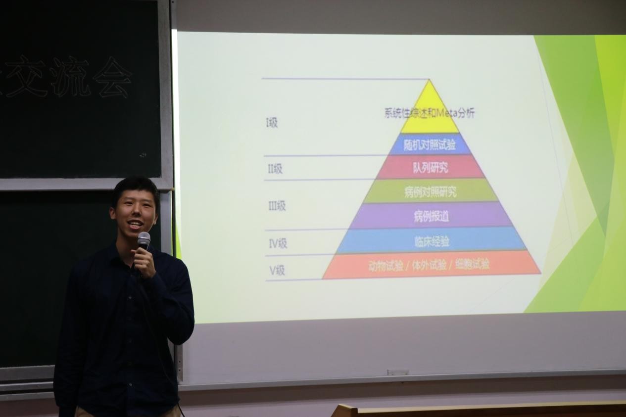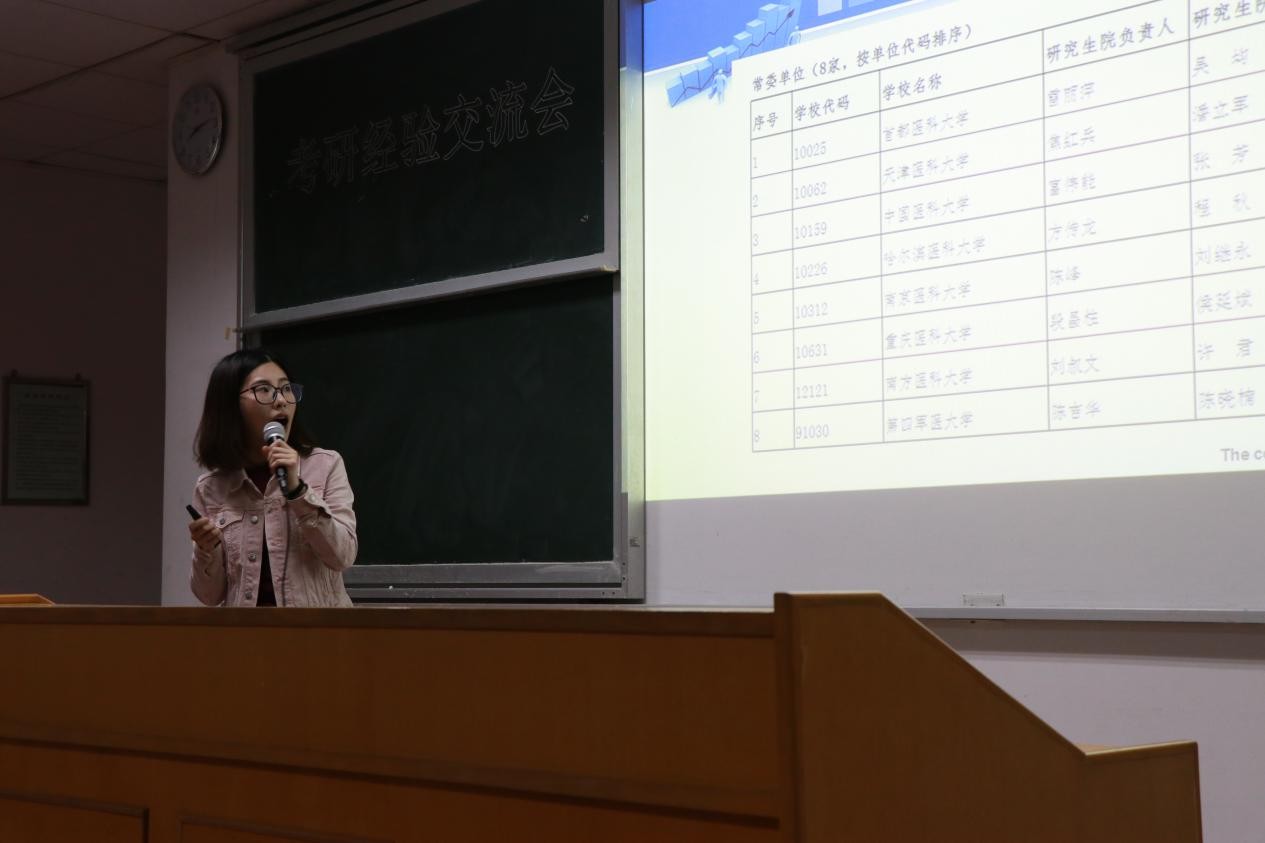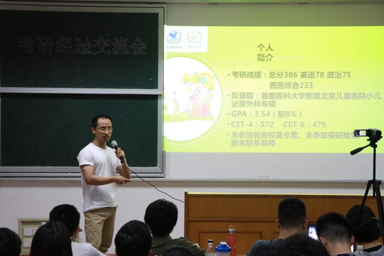 方一圩用自己的实习参与150余台手术的经历告诉在场的同学们,扎实的临床基础与考研一样重要。考上北京医科大学的邹淳讲述了一些自己在考验复习方面的经验,让在场的同学们获益匪浅。考研英语92分的杨楠彦以考研英语和托福考试特点进行对比,指出考研英语对词义的考察更全面细致,并且就算六级没有过,考研英语照样拿高分,为在场的同学们加油鼓劲。徐文倩用自己无缘一志愿、拟调剂录取中山大学的经验来和大家分享考研走过的弯路,指出慎重选择报考复试较晚的附院。被同济医学院录取的陆定恒传授了很多关于考同济医学院的经验。被上海交通大学录取的郭垒分享了报考研究生的注意事项和上海交大复试的经历,鼓励同学们考研报考名校,同时提醒大家备考要注意身心健康。考上复旦大学的庄冬丽、周璟介绍了复旦大学自主命题的复习方式、双盲面试以及调剂的注意事项,鼓励同学们不要紧张,沉稳应对复试。以高分被协和录取的王斌卿也传授了自己的复试经验,使同学们获益良多。最后,梁辉声分享了自己校外调剂的曲折之路,劝诫各位师弟师妹要全力备战不留遗憾。