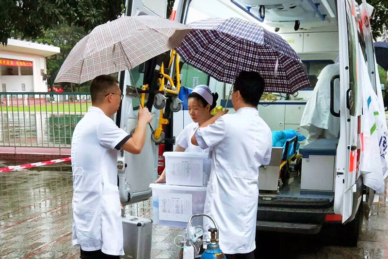 6月7日清晨,南方医院急诊科主任李旭带领科室骨干和相关人员,冒着大雨前往广铁一中为高考考生提供医疗保障服务。