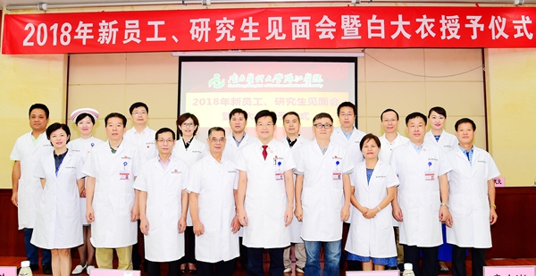 近日,珠江医院2018年新员工、研究生见面会暨白大褂授予仪式在24楼会议厅举行。广东省医师协会副会长吴少林、副秘书长苏慧萍,珠江医院全体院领导,相关机关领导共20余人出席了见面会。会议由副院长冯天元主持。