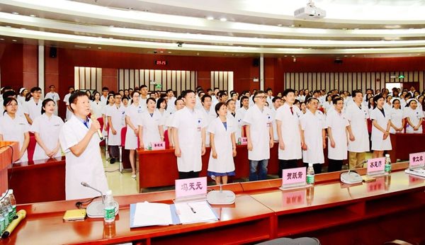 在激动人心的白大褂授予仪式环节,吴少林、苏慧萍及全体院领领导亲自为27位新入职人员亲自穿上了期待已久的白大褂。在冯天元的带领下,全体人员高举右拳,庄严地许下神圣誓言。铿锵有力的宣誓声回荡在会议厅里,一字一句皆是未来医生们将会毕生守护的承诺。