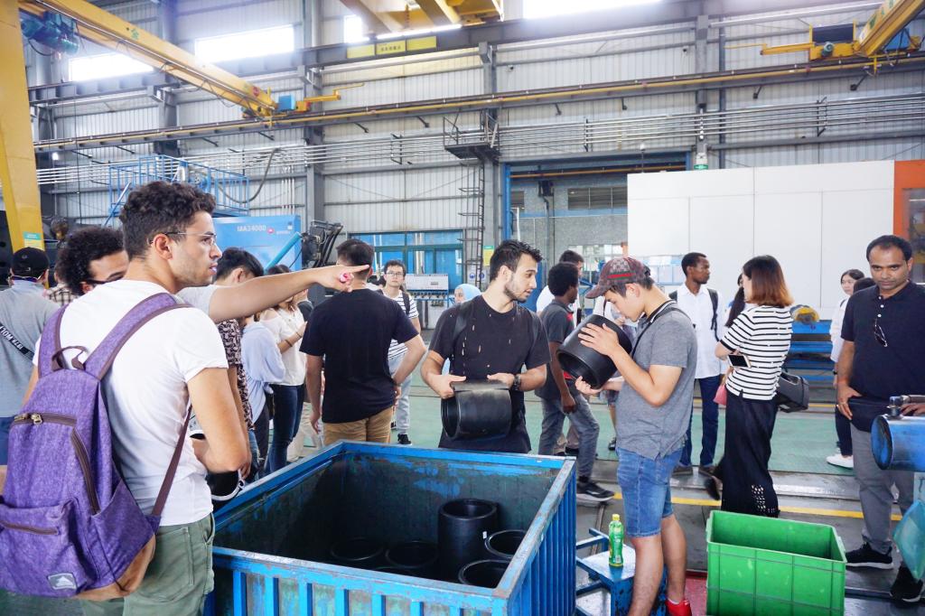 9月20日上午,留学生们来到佛山市顺德区联塑集团总部,在工作人员的带领下参观了生产车间。该企业是中国最大的塑料管道及塑料挤出生产设备的制造企业之一,同学们惊叹于如此大面积的流水线厂房中,只有两三名穿着整洁的工人从容作业。工作人员解释,现代生产车间早已告别了昔日劳动力密集、噪声大、环境恶劣的历史,全面实现了高度自动化的流水线作业。