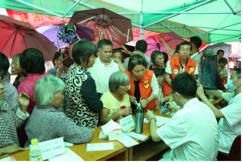 2018年9月16日,17级台风“山竹”带来了狂风暴雨,影响了广东省大部分地区,河源龙川一早也飘起了风雨。早上8点半不到,南方医科大学中西医结合医院李爱民院长带领专家团队一行15人如期到达龙川县黄石镇政府广场开始龙川站第二场义诊活动。台风欲来风满城,尽管下起了大雨,但是前来就诊的群众络绎不绝,早早就来到现场守候、等待派号,多位专家面前排起了长龙。据统计,当天上午专家们一共为近400名乡镇群众提供了免费诊疗服务。