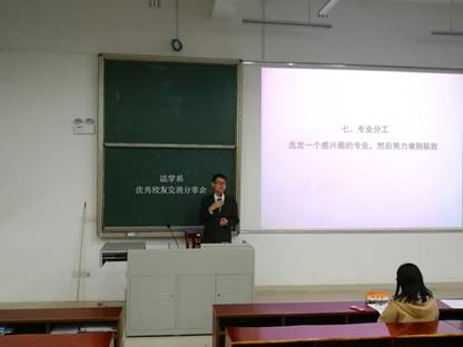 卓奕滨从大学四年概况、毕业十年轨迹、短期规划及总结感受几个方面分享了自己的奋斗历程。如今已成为律师的他,是佛山律师协会破产清算法律专业委员会委员兼秘书长、顺德政府部门的法律顾问,是顺德地区唯一入围广东省高级人民法院破产管理人名册的律师。回顾自己的十年,他向同学们讲述了自己经历的迷茫期、基础期和巩固期。从频繁换工作到逐渐找到自己的发展方向,他不断进行总结与反思。从求职面试、入行选择及到团队合作、专业分工,他给大家分享了自己多年拼搏的经验。“从他人身上学到的东西是有限的,从案例和书本上学到的东西是无限的”,他勉励同学们珍惜大学时光,从书籍中探索求知。