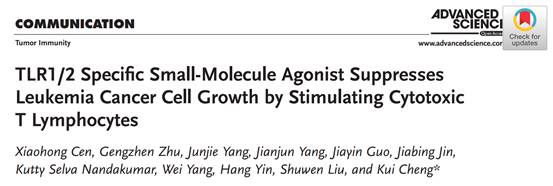 近日,我校药学院在TLR1/2特异性小分子激动剂研究方面取得新进展。研究结果以“TLR1/2 Specific Small-molecule Agonist Suppresses Leukemia cancer cell growth by stimulating Cytotoxic T lymphocytes(TLR1/2特异性小分子激动剂通过刺激毒性T淋巴细胞抑制白血病细胞生长)”为题,于3月28日在Advanced Science(IF=12.441)在线发表。药学院硕士研究生岑晓红、朱耿桢、杨俊杰为本文的共同第一作者,教授程魁为通讯作者。该课题受到国家自然科学基金、广东省青年珠江学者项目和南方医科大学高层次人才引进科研项目的支持;药学院教授刘叔文、Kutty Selva Nandakumar,基础医学院病理学系教授杨魏和清华大学药学院教授尹航参与了本项研究,为论文的共同作者。