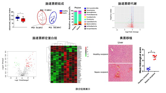 本课题进行了脓毒症病人临床粪便样品的研究,描述脓毒症患者与健康对照者粪便肠道菌群的系统性差异,通过16srDNA测序、代谢组学、宏蛋白组学多组学技术清晰地阐明脓毒症的发展进程伴随着肠道菌群的紊乱,包括菌群组成成分、功能代谢方面的显著改变。通过从人类到小鼠的粪菌移植验证失调的肠道菌群在脓毒症发病机理的重要作用,并证实了来自脓毒症患者的粪便可导致小鼠CLP后的肝脏损伤明显加重,肠道菌群的紊乱可被认为是促进脓毒症相关器官损伤的重要上游因子。本研究有助于为脓毒症的发病机制,潜在诊断细菌标记物以及脓毒症的治疗预后控制提供了新的见解。在未来,针对肠道菌群紊乱的靶向治疗调节可以成为治疗脓毒症的新方向。