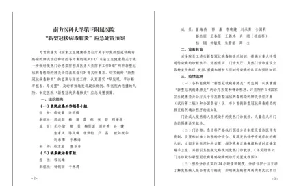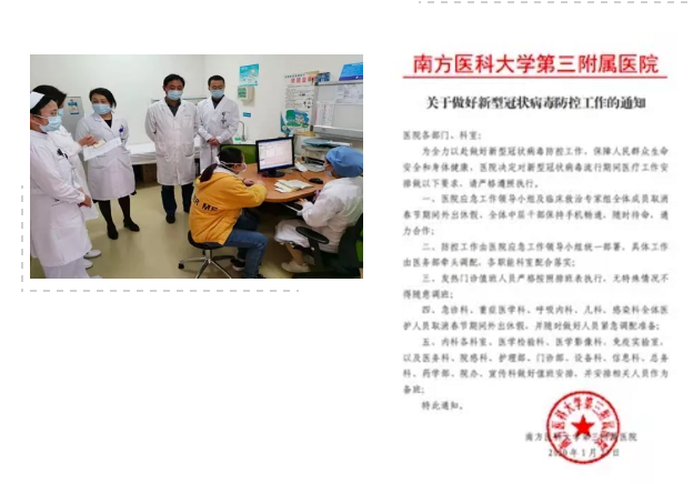 第一时间迅速制定出台《南方医科大学第三附属医院“新型冠状病毒肺炎”应急处置预案》,成立由书记、院长担任组长,所有党委委员及相关职能科室负责人组成的应急工作领导小组;组织呼吸内科、院感科、急诊科及其它相关临床科室医务人员组成临床救治专家组,制定工作任务和流程,全员武装上阵。
