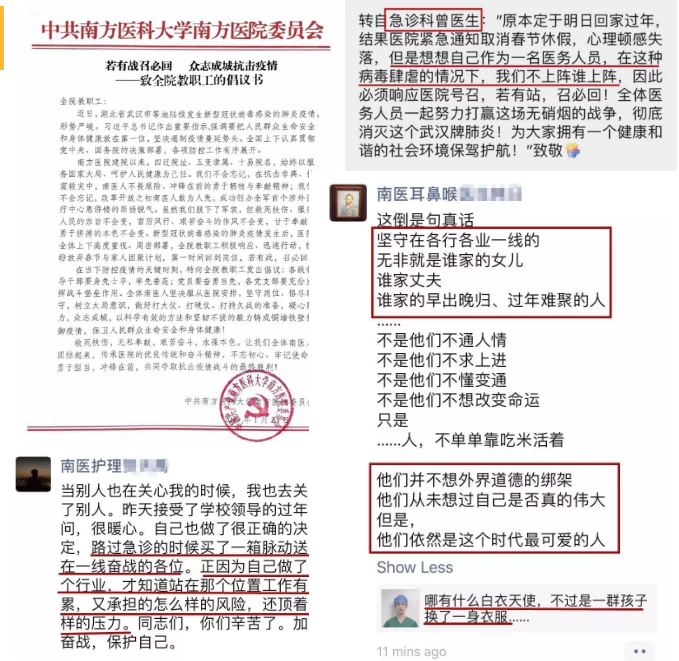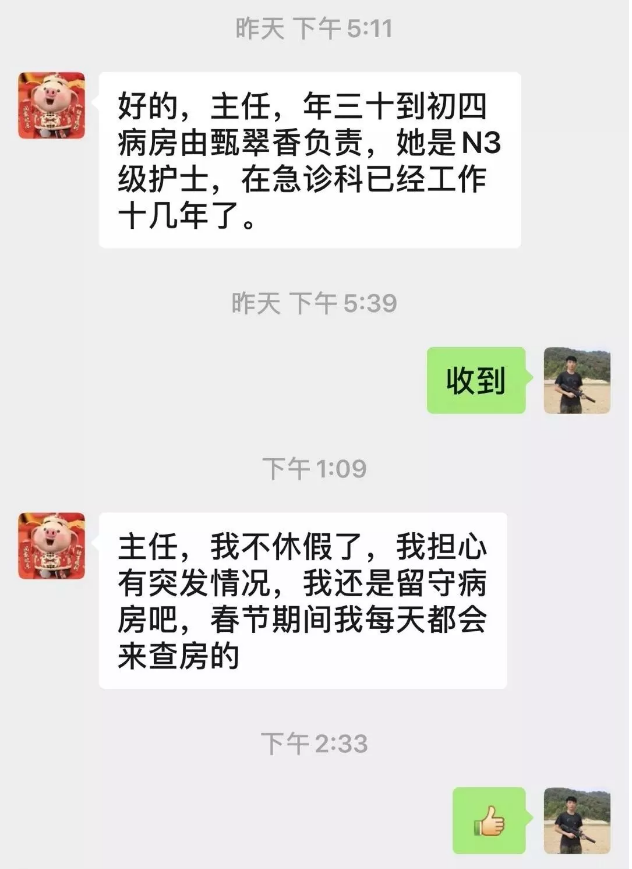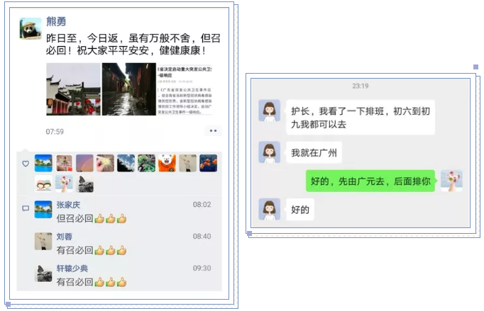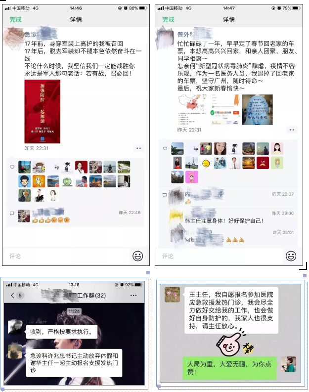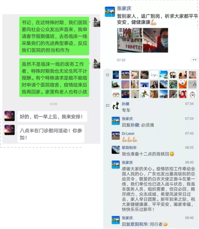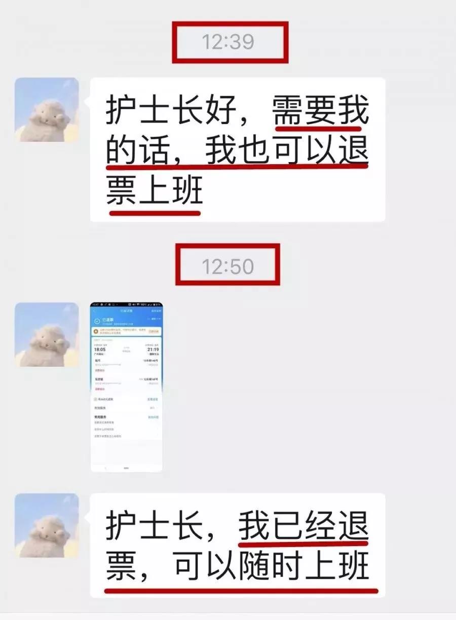 很多已经赶回老家准备和家人团聚过年的医护人员立即买了返程票,回到医院支援发热门诊或参与科室值班。居住在广州及附近的医护人员乃至行政后勤人员更是主动请缨,要求返回医院与坚守在抗击疫情一线的战友并肩作战,或表示随时待命,有战必应、有召必回。