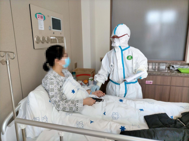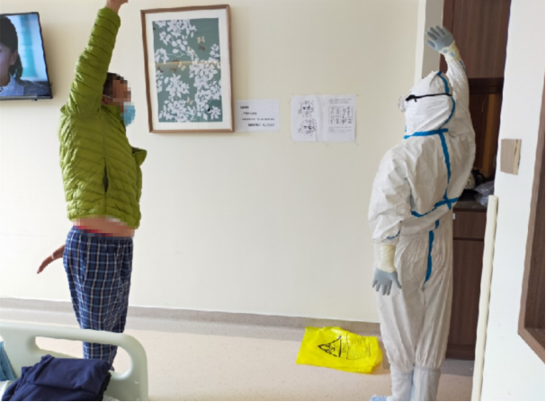 隔离病房活动范围小,方寸之地禁锢了孩子们的天性,也使那些曾驰骋广场的大爷大妈没了锻炼的机会。天天躺在床上,不仅腰酸背痛,胃口也不好,吃不下,排便不畅成了困扰他们的一大问题。病区中医科的专科护士教他们做操、打拳,学习八段锦。她穿着笨重的防护服,穿梭在每个病房,打起拳来一招一式都略显憨态,惹得叔叔阿姨们笑声不断。对天天玩手机的年轻人,她又化身理疗行家,为他们进行头部穴位按压,缓解他们头昏脑涨、视力模糊的症状。
