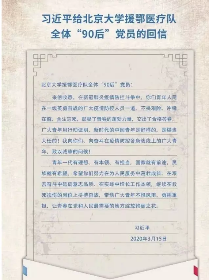 2020年3月15日,习近平主席给北京大学援鄂医疗队全体“90”后党员回信,向奋斗在疫情防控各条战线上的广大青年致以诚挚的问候。