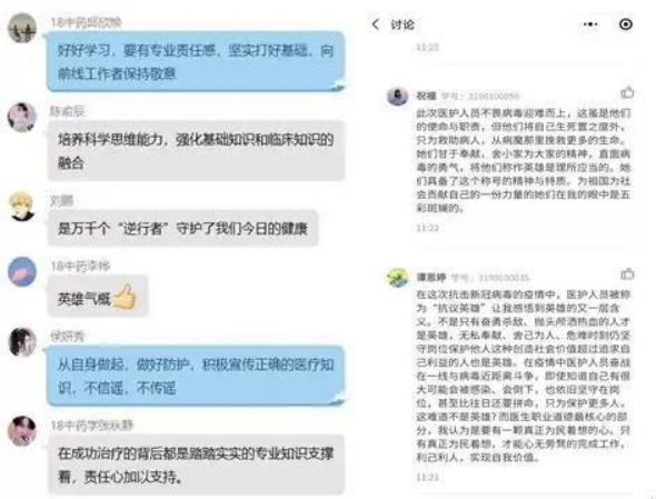 2018级护理学林璟薇同学留言道:“通过这次形势与政策课,我了解到我们学校教授和医生的伟大,同时也感到非常自豪。作为他们的学生,我们也应该像他们一样献身医学,热爱祖国,忠于人民,恪守医德,竭尽全力除人类之病痛,助健康之完美,维护医术的神圣和荣誉。”