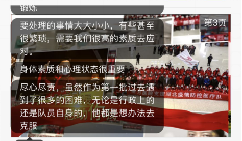 作为一名90后党员,在国家和人民需要我们的时候,就要挺身而出,团结带领身边的战友投身到抗击疫情的战斗中。如果武汉人民需要、国家和组织需要,我愿意继续战斗在武汉疫情最前线,直至取得抗击疫情最后胜利的那一刻!