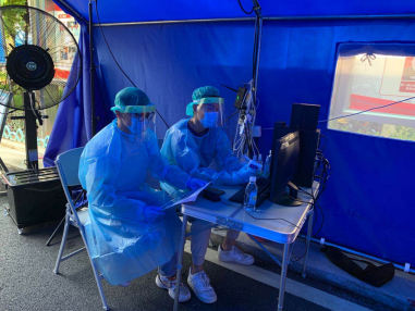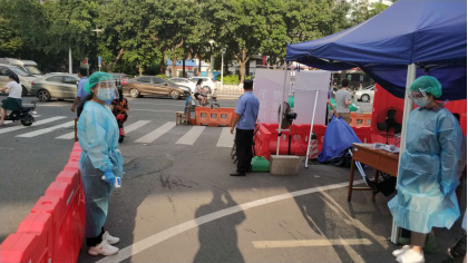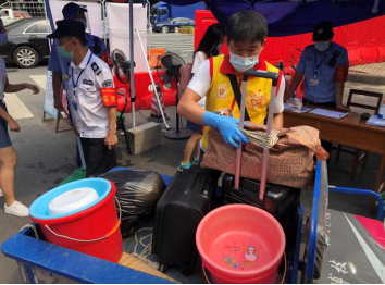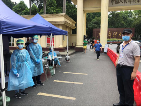 2014级第一临床医学院临床医学八年制韩磊同学对自己的工作状态进行了详细的记录:烈日下,一身淡蓝色的防护服,穿戴着防护面屏、帽子、手套,开始为时两个钟的志愿者值班。因为天气太热,慢慢的衣服逐渐湿透,带着手套的双手感觉到肿胀,甚至有些麻木。韩磊同学说,此时方才能够亲身体会到,那些为了抗疫不分日夜工作的人们的辛苦,心中顿时肃然起敬。