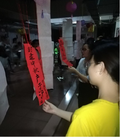 活动开始前,已有三两博雅学子驻足春草园一栋天井,兴致勃勃地研究灯谜。猜灯谜又称打灯谜,是中国独有的富有民族风格的一种传统民俗文娱活动形式。夜幕降临,灯谜与红灯笼相间,毛笔书写的灯谜再现传统灯谜的历史厚重感,更为中秋游园会增添几分诗意,展现博雅学子的“博学”之气。