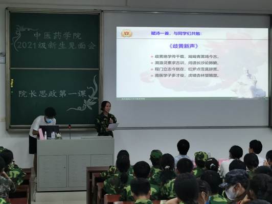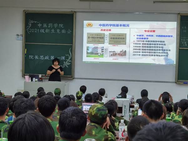 副院长孙晓敏介绍了中医药学院的概况,带同学们回忆了南医大和中医药学院的光荣历史,让新生感受到学校和学院的红色基因和精神传承;同时,展示了中医药学院优厚的教学师资、办学定位以及人才培养的定位与目标,旨在培养“厚基础,宽视野,强能力,重创新”的中医药人才,对重点学科和临床教学成果、学院的特色品牌教学育人活动、优秀毕业生代表进行了生动展示和介绍。她以一首小诗《旗黄新声》 赠与全体新同学,寄予厚望:“歧黄绝学传千载,呦呦青蒿鸣今古。 溯源灵素求古训,问道长沙论肺腑。 程门立志今犹在,红炉点雪莫辞苦。 南医学子多才俊,虎啸杏林望翘楚。”