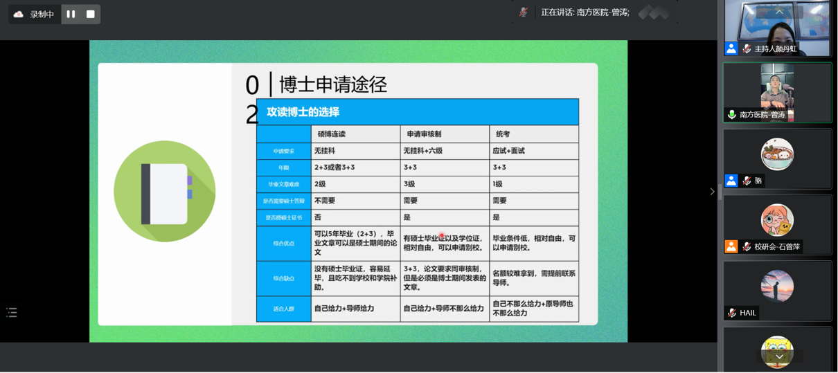 嘉宾分享环节,肾内科专业的博士研究生曾涛,结合个人经验,细致地讲述了自己在升学读博过程中的考虑因素与博士申请途径,也给大家介绍了一些科研常用软件,帮助大家更好地寻找科研方向。