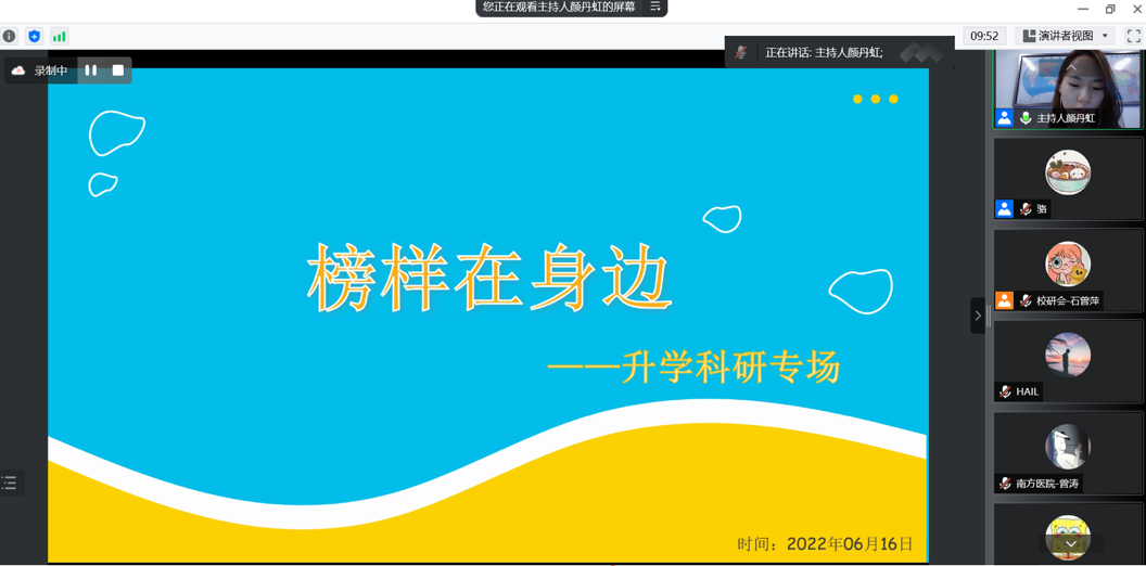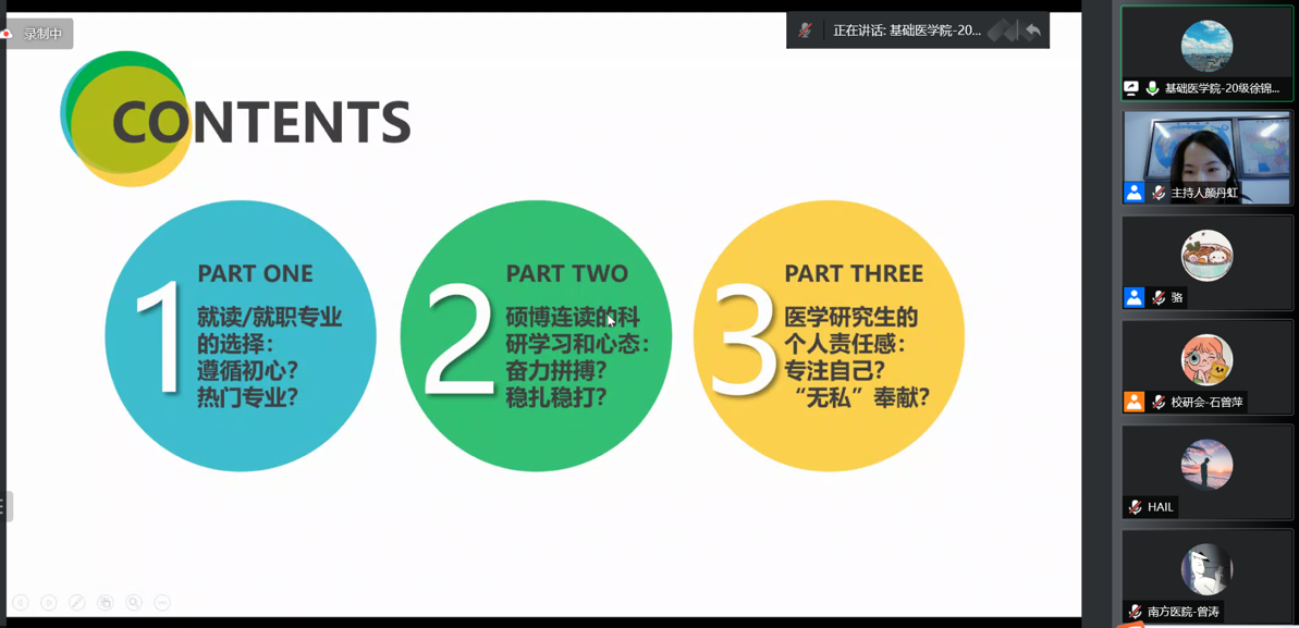 本次分享会邀请了第一临床医学院博士生曾涛、基础医学院博士生徐锦富和中医药学院博士生蔡晓雯,三位博士生结合自身经历和感悟,为同学们带来“科研与升学”专题分享,讲述了医学研究生硕博连读申请的经验心得,并给出科研学习的方法、心态调整方面的建议,希望能给科研路上心存迷茫的学子提供参考。分享会通过线上形式开展,分为嘉宾分享和互动答疑两个环节。