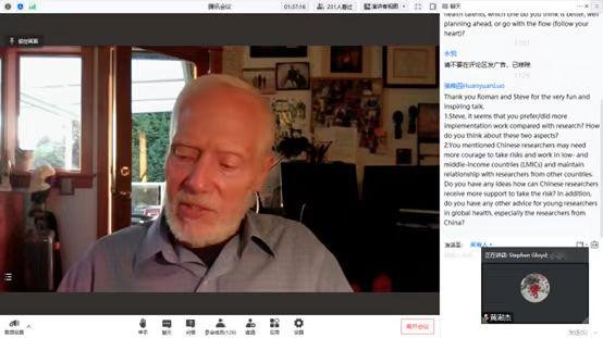 Gloyd教授在访谈中回顾了自己的学术人生、在莫桑比克、科特迪瓦等地开展全球健康工作的经历,以及建立华盛顿大学全球健康系的历程。他也阐述了中国学者加入的全球健康研究和实践的优势和意义。Gloyd教授在美国顶级医学院校毕业后,去莫桑比克从事了多年的基层卫生临床工作,后期回到美国,参与创办了华盛顿大学全球健康系以及Health Alliance International(HAI)。一对一访谈结束后,武汉大学的黎浩教授、北京大学尹惠教授、中南大学王红红教授,以及中山大学顾菁教授等作为对话嘉宾, 和Gloyd 教授在现场就全球健康合作伙伴关系中去殖民化和中国学者如何拓展全球合作等热点问题进行了探讨。最后,Gloyd回答了现场观众关于全球健康的学者如何平衡学术研究和全球健康实践工作,以及在目前国际环境下开展全球健康工作的困难、挑战和机会等问题。