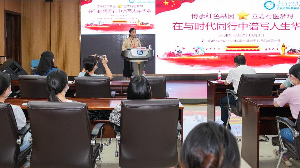 10月9日,第三附属医院(第三临床医学院)党委书记 许明辉以“传承红色基因,立志行医梦想,在与国同行中书写人生华章”为题,为2021级全体研究生和2022级5+3专业型硕士研究生开讲秋季学期第一堂思政课。220名研究生到场聆听。