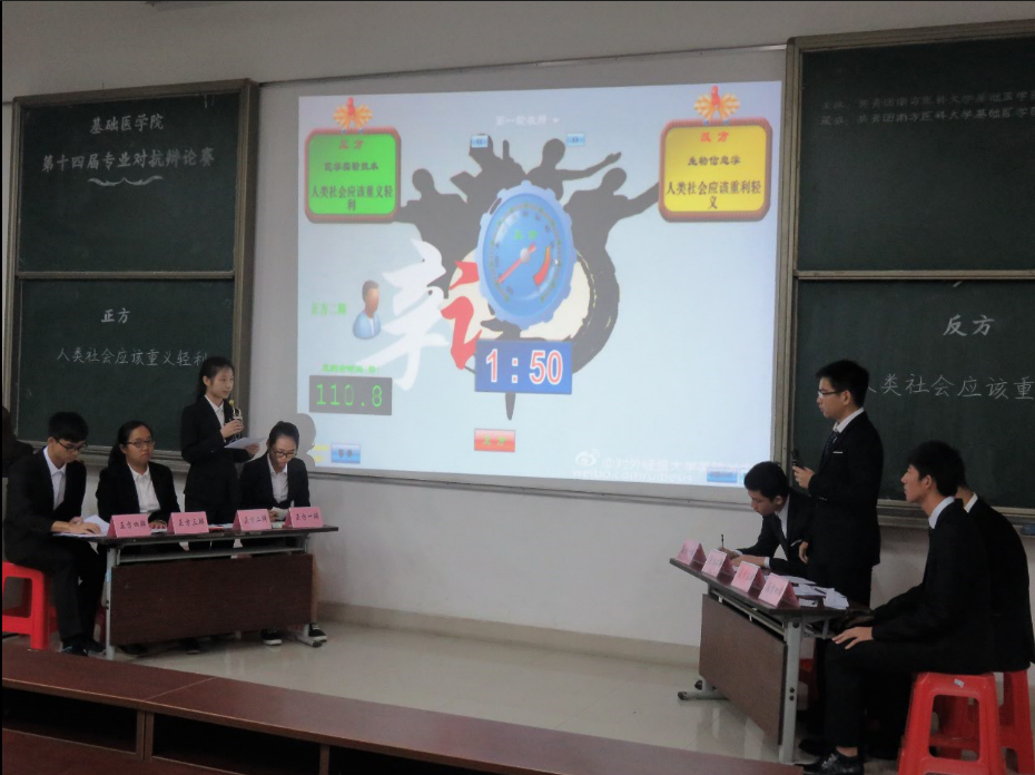 进入冠军争夺战,医学实验技术专业队与生物信息队就“人类社会应该重义轻利还是重利轻义”这一辩题展开了唇枪舌战。双方选手在立论、驳立论、智辩等各个环节中思路清晰,引经据典,现场气氛迅速升温。持 “人类社会应该重义轻利”的生物信息学专业代表队逻辑清晰,阐明重义轻利对人类社会发展所起到的推动作用,并引用孔子的经典言论“君子喻于义,小人喻于利”加以佐证。秉持“人类社会应该重利轻义”的医学实验技术专业代表队针锋相对地提出“没有利益的获取,重义就是空谈”的观点,利是基础,是社会发展的原动力;而义只是通过对利益关系的调节,来间接影响社会发展,并通过马克思在指导国际工人运动时所提出的“人们奋斗所争取的一切,无不同他们的利益有关”的观点,有力地证明了追求利益的必要性与合理性。