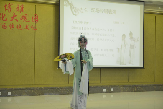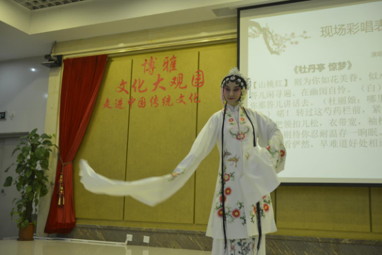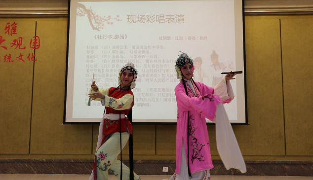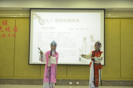 在介绍完昆曲的基本情况后,孙珉对我国戏曲史上杰出的浪漫主义作品——汤显祖的《牡丹亭》进行赏析。她给大家介绍了《牡丹亭》故事的梗概:“《牡丹亭》表现了人性的苏醒,表现了以情抗理的人生理想和文人情怀,凸显了‘情不知所起,一往而深。生者可以死,死可以生’这样一种有情人生的最高境界。”赏析过程中还穿插有《游园》、《寻梦》、《惊梦》三场彩唱表演。五山昆曲社的江南和枫叶两位老师以灵绝的身段、清丽的演唱、温婉的动作赋予了杜丽娘、柳梦梅等人物灵魂,以丰富的内容,深刻的思想及绚丽优美的词乐韵律在方寸大小的舞台上呈现了三场精美的舞台表演,凸显了中国昆曲灼灼其华、恒久弥远的艺术魅力。老师们精心准备的表演令人如在梦境,全然忘我。