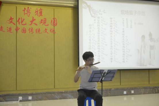 孙珉从昆曲的源流开篇,将历史的画卷铺陈在听众眼前。从明朝到现代,细数了昆曲的悠久绵长;从昆腔初创到俗雅争胜,道尽了昆曲的兴盛衰落。她谈道:“昆曲是文学、音乐、舞蹈、美术、杂技等各种艺术元素融会贯通,构建而成的一个多姿多彩的艺术宫殿。它是卓越的文学性与音乐性的完美结合。舞台上人物的喜怒哀乐全部通过深沉哀婉的唱词(文学性)和音乐旋律表达出来。”昆曲之曲谱和唱词均出自文豪大家之手,往往风雅韵致,情至格高,历代均为士大夫所好之事。为让大家充分感受到昆曲的“音乐性”,五山昆曲社的何增莹老师还现场给大家吹奏了一曲“皂罗袍”。