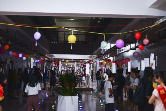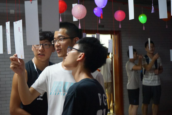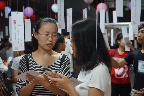 首先映入眼帘的是流光溢彩的花灯以及底下垂挂着的随风舞动的灯谜。猜灯谜又称打灯谜,既能启迪智慧又迎合节日气氛,是中国独有的富有民族风格的一种传统民俗文娱活动形式。一句灯谜,亦庄亦谐,传递的不仅仅是解谜的兴趣,还有文化的芬芳。谜语形式多样,包括诗词、典故、习俗、传说等多种传统体裁,突出灯谜一波三折的趣味性。柔和的月光及趣味的现场引得许多同学驻足。他们仔细琢磨着彩灯下的谜语,与身旁的同伴合作交流,尽管有解答不出灯谜的遗憾,但更多的是猜出灯谜后的欢乐与喜悦。只要猜出谜底,便可带上谜语和答案前往陶味居向书院工作人员兑换奖品——月饼。本次观灯猜谜活动共准备了700多个谜语,活动从晚上9时持续到11时。