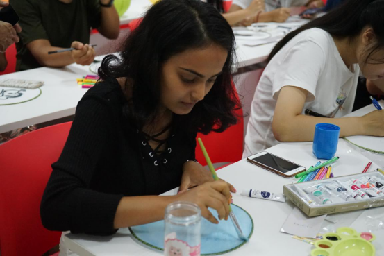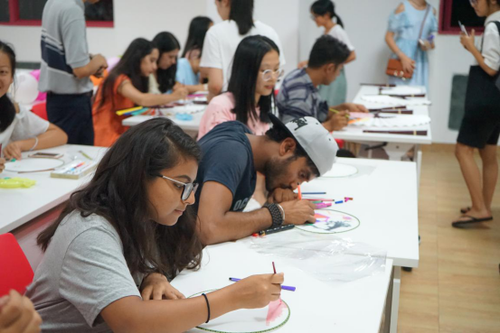 除了赏灯猜谜之外,博雅书院还在学思阁为大家准备了手绘团扇、折扇、彩灯等传统手工艺活动。活动开始没多久就吸引了一大批学生,还有许多外国留学生参与其中。他们尽情挥舞着手中的画笔,绘制出风格各异的作品。有的心灵手巧,很快做出了雏形,有的稍显“笨拙”,却也认真地在完成每一个步骤。没过一会儿,扇子上、彩灯上便呈现出各种图案,有一树梅花,也有两只玉兔,还有诗句……虽然制作的过程并不容易,但是看到自己的作品,大家还是充满了喜悦。有些同学还准备将自己精心创作的作品送给室友,表达美好的节日祝愿。