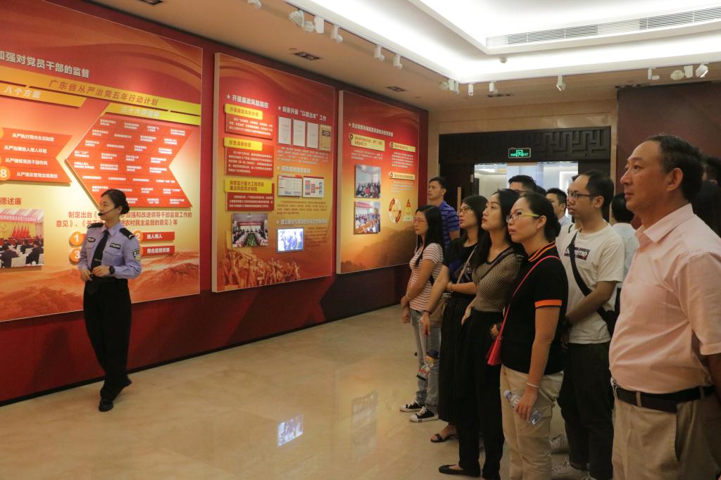 广东省反腐倡廉教育基地以“反腐倡廉,警钟长鸣”为主题,充分运用多媒体手段,对党员尤其是党员干部开展体验式、互动式、启发式的思想教育。展览共设“风正帆扬”、“从严治党”、“贪腐鉴录”、“拒腐防变”和“清风正气”等五大部分,通过工作人员的生动讲解,在场学员深入学习了党中央、中央纪委、广东省委历任领导对反腐倡廉工作的重要论述,了解了我党反腐倡廉的历史沿革,以及广东省在反腐倡廉建设方面取得的丰硕成果,重温了焦裕禄等勤廉人物的廉洁故事。