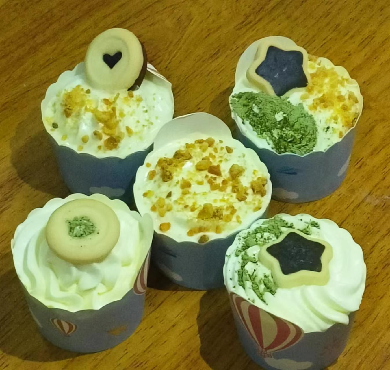 第四次烘焙课程,学员们学习了奶油纸杯蛋糕。分离蛋黄、过筛面粉、搅打蛋清,每一个繁琐的步骤都井井有条地进展着。学员们发挥着自己的想象力,挤出各式各样的奶油顶,场面十分热闹。