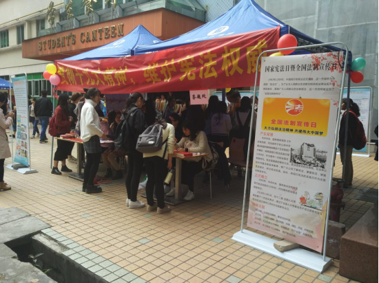 今年宪法日的主题是“贯彻十九大精神,维护宪法权威”。现场共发放宣传资料500余份,解答法律问题10余道,有奖问答150道题目。主要针对校园安全、网络安全、校园代理等和大学生关系密切的问题展开宣传。现场气氛热烈,互动积极。