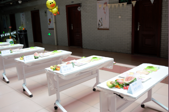 为了这次比赛,社区生活部做出了精心的准备,走道上摆放了莲花灯,房檐系上了气球,以及天井处整齐的桌子,都是他们用心对待的证明。原材料方面,从水果刀、刨刀等刀具,到西瓜、奇异果、香蕉等水果,还有花式的水果盘、一次性手套、牙签、胶质砧板等工具,他们准备的可谓应有尽有。