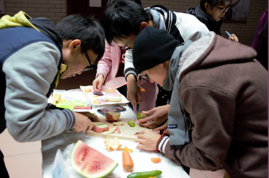 随着主持人的一声“开始”,水果拼盘大赛正式开始,在场的12支队伍立刻进入紧张状态,迫不及待地投身比赛。每个参赛队伍都分工明确,有条不紊地进行创作。有的成员负责在网络上搜索精美水果拼盘的图片,有的成员负责给水果削皮,还有的成员负责把水果切出自己想要的形状。此次比赛不仅要求参赛队伍中的选手们合作摆放出精美的水果拼盘,还要他们赋予作品美好的寓意。因此,参赛的队伍们都积极地参与讨论,说出自己的想法,并贯彻到作品中。有的队伍以宿舍为单位,将水果比喻成宿舍的成员;有的队伍选择圣诞节作为主题;有的队伍则是将收获快乐放在第一位,一边制作,一边品尝香甜的水果。