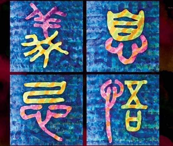 “意义”、“恩怨”、“愉悦”、“自我”等词也同样有着它独特的构成思维和心灵智慧。在介绍“自我”这个词时,皮老师还给大家呈现了一副“自省图”。该图由“义息忌悟”四个字组成。皮老师用逐一解构了这些汉字,又重构了它们的意义和内涵。如“义”的繁体字,表示是“将我置于美好的规范之下,成就生命的意义”;“息”是“把自己放在心上,顺应自然的生理需求,休养生息”;“忌”是“以自我为中心的禁忌,是一种为人处世的忌讳”;“悟”则是“直面我心,是自省。”“自省图”所要表达的是“表达的是自我完善的仁义,自尊自惜的休养生息,以自我中心的禁忌,开启心智的觉悟。”